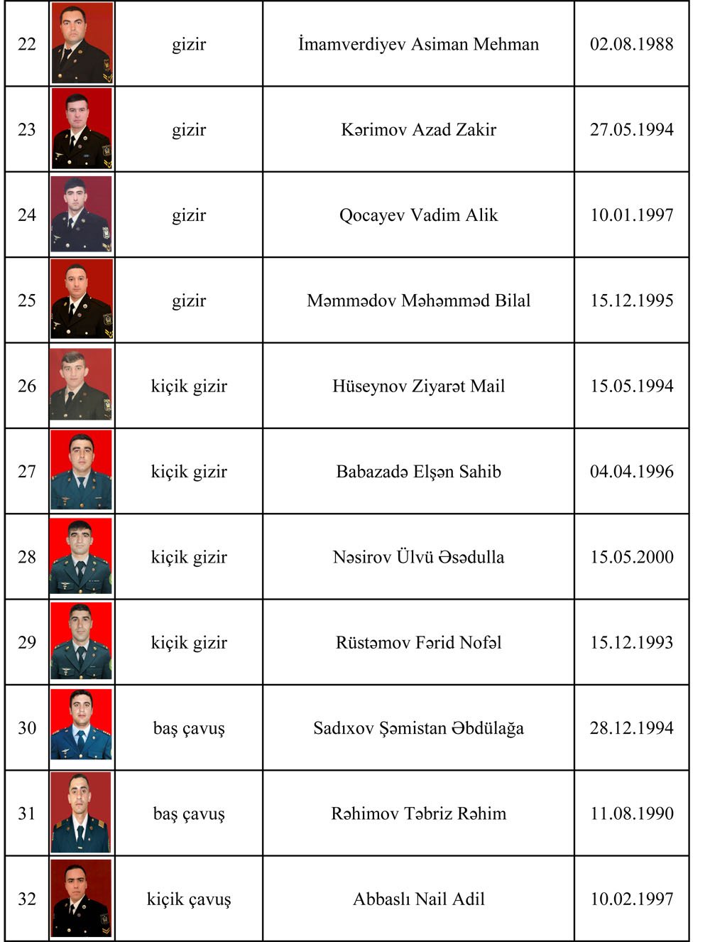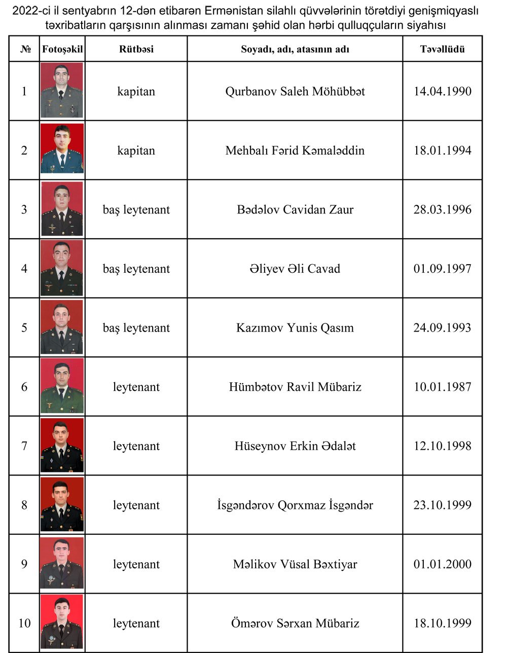 2022-ci il sentyabrın 12-dәn etibarәn Ermәnistan silahlı qüvvәlәrinin törәtdiyi genişmiqyaslı tәxribatların qarşısının alınması zamanı şәhid olan hәrbi qulluqçuların siyahısı