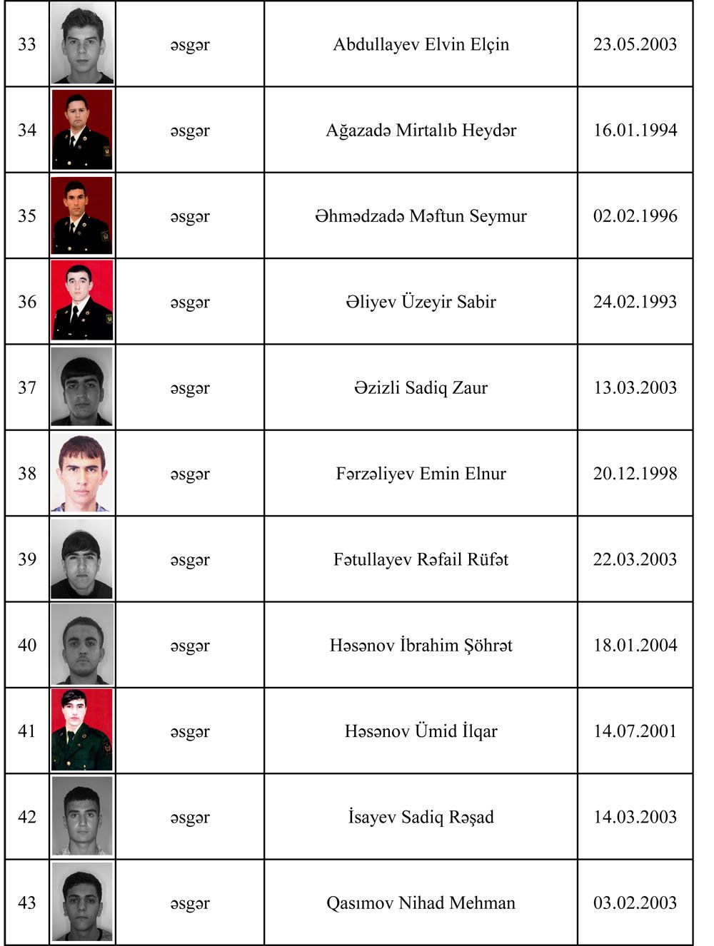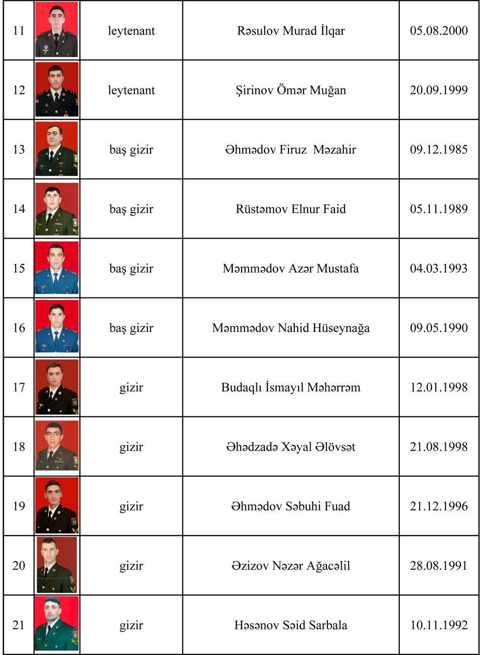 Ermənistan silahlı qüvvələrinin törətdiyi təxribatların qarşısının alınması zamanı şəhid olan hərbi qulluqçuların SİYAHISI