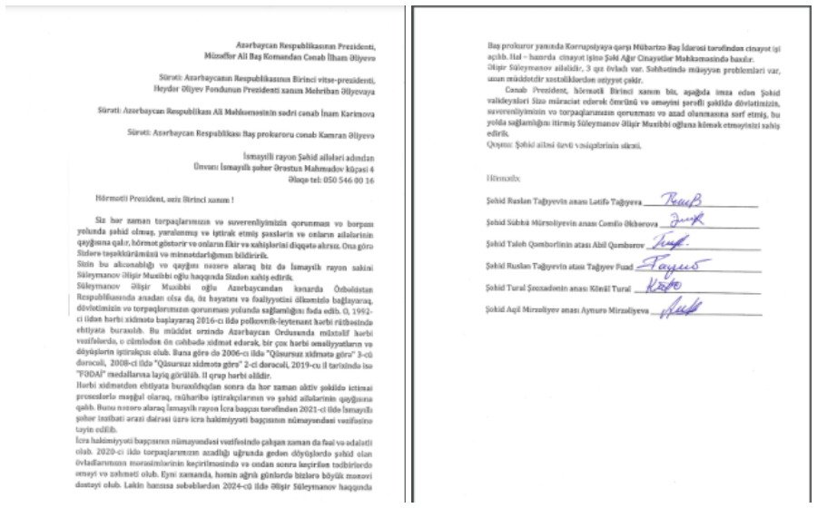 Müraciətin sonunda İsmayıllı rayonunun şəhid valideynləri Azərbaycan Prezidentindən və Birinci xanımdan ömrünü dövlətin və torpaqların müdafiəsinə sərf etmiş, bu yolda sağlamlığını itirmiş Süleymanov Əlişir Muxibbi oğluna kömək göstərilməsini xahiş edirlər.