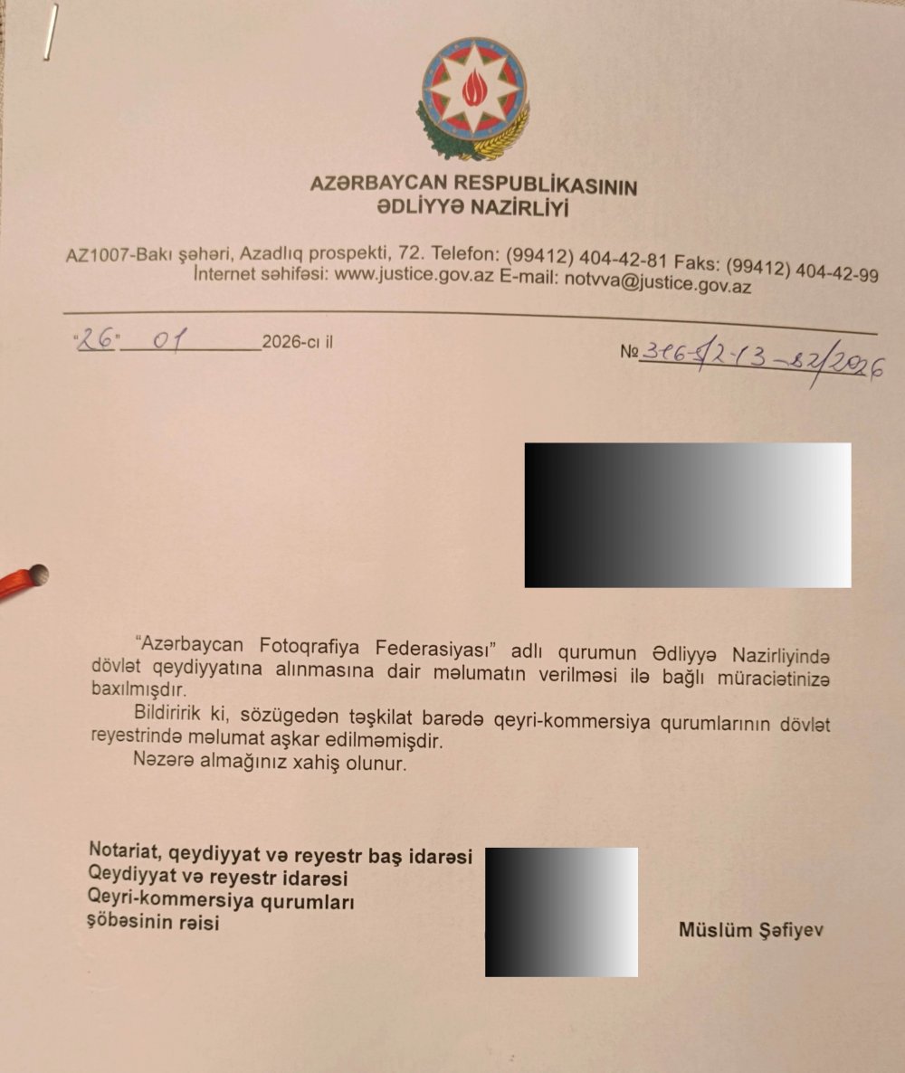 Aşağıda Azərbaycan Fotoqrafları Birliyinin rəsmi müraciətinə cavab olaraq Azərbaycan Respublikasının Ədliyyə Nazirliyindən daxil olmuş məktub təqdim olunur.