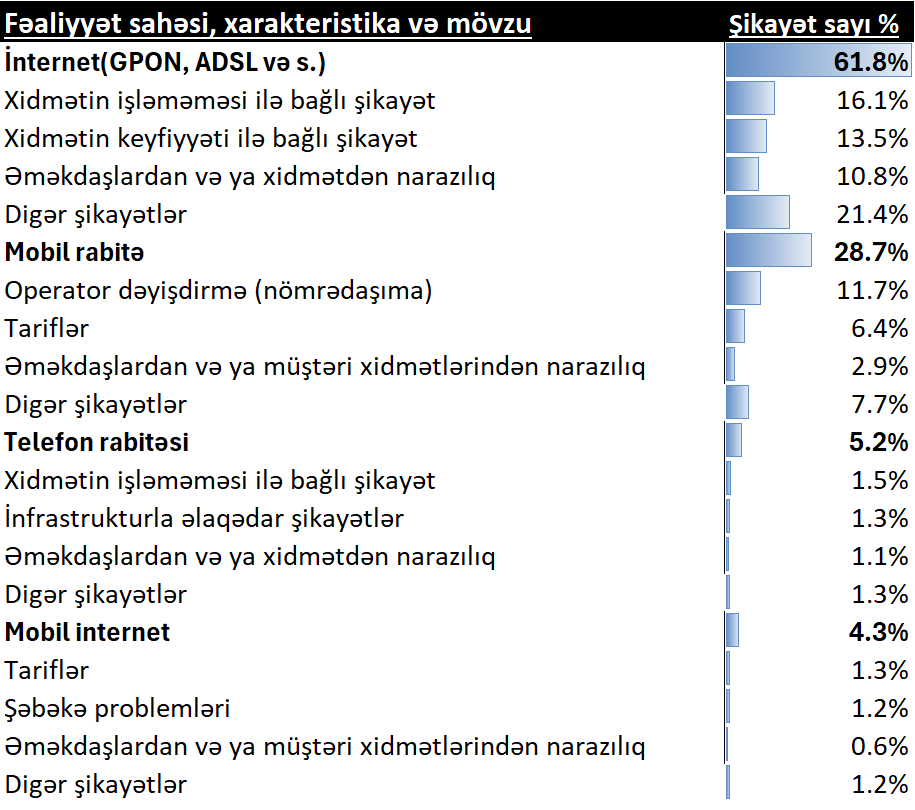 Telefon rabitəsi xidməti üzrə müraciətlərin 1,5%-i xidmətin işləməməsi, 1,3%-i infrastruktur problemləri, 1,1%-i isə xidmət təchizatçıları tərəfindən istehlakçılara göstərilən xidmətlərlə bağlıdır.