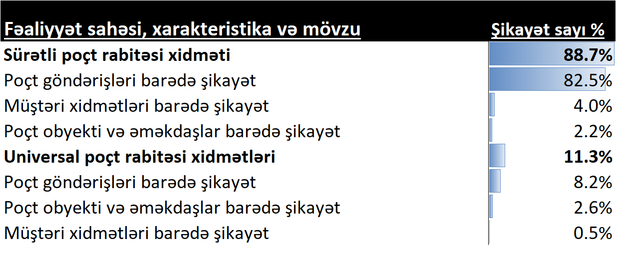 Poçt rabitəsi xidmətləri üzrə 2026-cı ilin birinci rübü ərzində 550 müraciət daxil olub. Bu da 2026-cı ilin birinci rübü ərzində sistemə daxil olan ümumi şikayətlərin 31,6%-ni əhatə edir. Poçt rabitəsi xidmətlərində müraciətlərin 90,7%-i poçt göndərişlərinin gecikdirilməsi, çatdırılmaması və ya itirilməsi barədə olub. 4,5% müraciətlər müştəri xidmətləri, digər 4,8% isə ödənişlər, poçt rabitəsi operatorunun yerləşdiyi obyektin vəziyyəti, istifadə olunan proqram təminatının işləkliyi barədə qeydə alınıb. Ümumilikdə isə müraciətlərin 88,7%-i sürətli poçt xidmətləri, 11,3%-i universal poçt xidmətləri barədə olub.