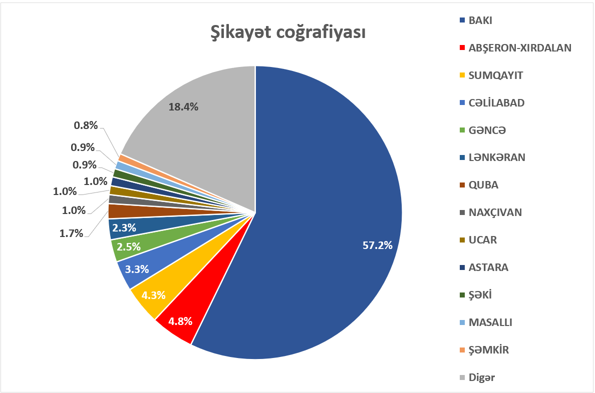 Beləliklə, ünvan olaraq müraciətçilərin 57,2%-i Bakını qeyd edib. Abşeron – Xırdalan üzrə bu göstərici 4,8%, Sumqayıt üzrə isə 4,3% təşkil edib. Daxil olan müraciətlərin ümumilikdə 78,9%-də vətəndaşlar əsasən 10 bölgəni – Bakı, Abşeron – Xırdalan, Sumqayıt, Cəlilabad, Gəncə, Lənkəran, Quba, Naxçıvan, Ucar və Astaranı ünvan olaraq göstəriblər.