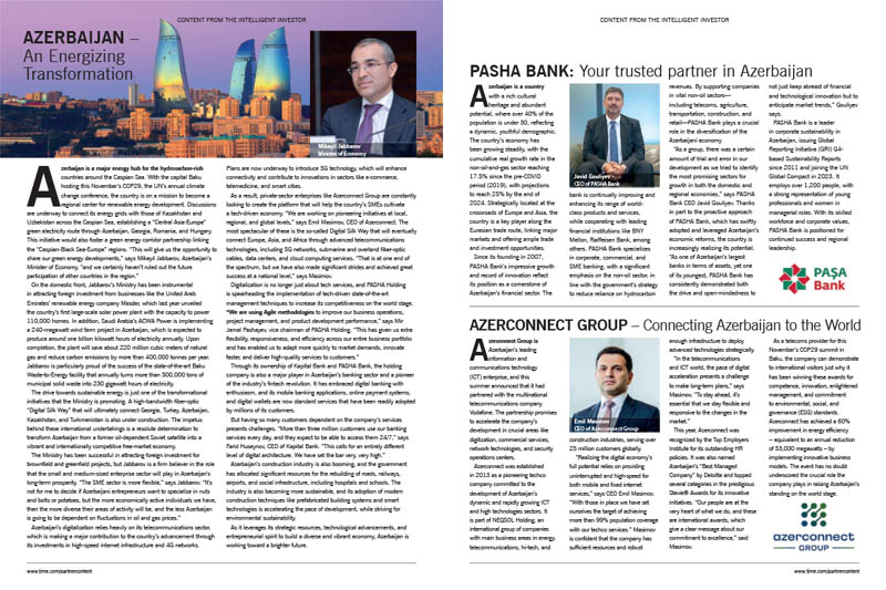 TIME, one of the world’s most-read magazines, highlighted Azerconnect Group’s activities in its recent article on Azerbaijan. The article titled “Azerconnect Group – Connecting Azerbaijan to the World” recognizes Azerconnect Group as a leading ICT company, shedding light on the strategic partnership signed earlier this year with the world’s telecommunications giant Vodafone. The article notes that the partner agreement will enable Azerconnect Group to accelerate development in crucial areas such as digitization, security operations centres, network technologies and commercial services.