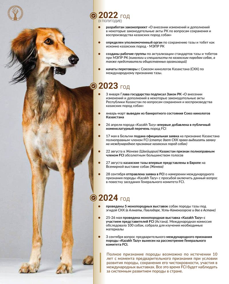 За прошедшие два года была проведена серьезная работа: внесены изменения в соответствующие законы, утвержден стандарт тазы, проведены научные исследования, племенные смотры и выставки.